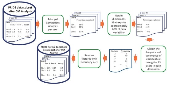 We run a Principal Component Analysis over every user of the PRIDE dataset in order to identify those features that best describe the variability of the data in the dataset; in this way, we are able to remove those features that do not contribute sufficiently to data variability.