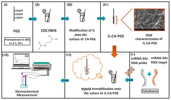 Experimental scheme presenting the pretreatment of PGE (i); the activation of PGE with EDC/NHS (ii), modification of IL onto the surface of CA/PGE (iii); microscobic characterization of electrodes (iv), the hybridization between miRNA-34a target and its complementary DNA probe (v); immobilization of the hybrids at the surface of IL/CA/PGE (vi); electrochemical measurement (vii).