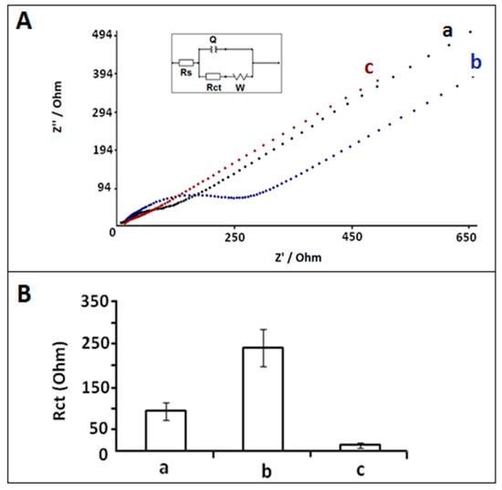 (A) Nyquist diagrams of (a) PGE, (b) CA/PGE, (c) IL/CA/PGE in 2.5 mM Fe(CN)63−/4−. (B) Histograms representing the average Rct values of (a) PGE, (b) CA/PGE, (c) IL/CA/PGE (n = 3). Inset was the equivalent electrical model used to fit the impedance data. The impedimetric results were fitted by using an equivalent circuit model, R(Q(RW)) the parameters of which are listed in the text; RS is the solution resistance. The constant phase element Q is then related to the double layer capacitance at the electrode-electrolyte interface. Rct is related to the charge transfer resistance at the electrode-electrolyte interface. The constant phase element W is the Warburg impedance due to mass transfer to the electrode surface.