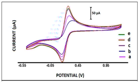 Next, the electrochemical surface characterization of PGE, CA/PGE and IL/CA/PGE was determined by using CV as seen in Figure 3. The average anodic peak current (Ia) of PGE, CA/PGE and 20% IL modified CA/PGE was measured as 81.95 ± 4.33 µA (RSD%, 5.29%, n = 3), 60.07 ± 2.68 µA (RSD%, 4.46%, n = 3) and 122.33 ± 10.64 µA (RSD%, 8.70%, n = 3) Figure 3. After IL modification onto CA/PGE surface 103.60% increase at anodic peak current was recorded (Figure 3b–d) due to the fact that the repulsive electrostatic interaction between IL and anionic redox [Fe(CN)6]3−/4− ions at the surface of IL/CA/PGE. The role of IL is to accelerate the electron transfer and accordingly, an increase at Ia was recorded comparison to the ones obtained by PGE and CA/PGE.