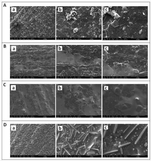 SEM images of (A) unmodified PGE, (B) CA modified PGE, (C) IL modified PGE, (D) CA and IL modified PGE using identical acceleration voltage as 5.0 kV with resolution at (a) 50 µm, (b) 10 µm and (c) 5 µm respectively.