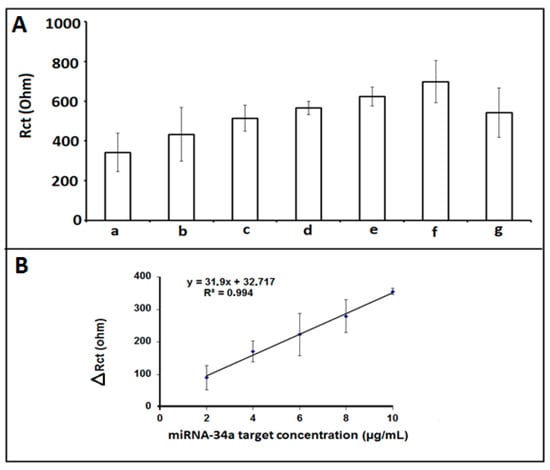 (A) Histograms representing the Rct values obtained by (a) 1 µg/mL miRNA-34a DNA probe, after hybridization between 1 µg/mL miRNA-34a DNA probe and different miRNA-34a RNA target concentrations (b) 2 µg/mL, (c) 4 µg/mL, (d) 6 µg/mL, (e) 8 µg/mL, (f) 10 µg/mL (g) 12 µg/mL. (B) The calibration graph obtained from Rct values measured in the presence of different concentration of miRNA-34a target, ranging 2–10 µg/mL.