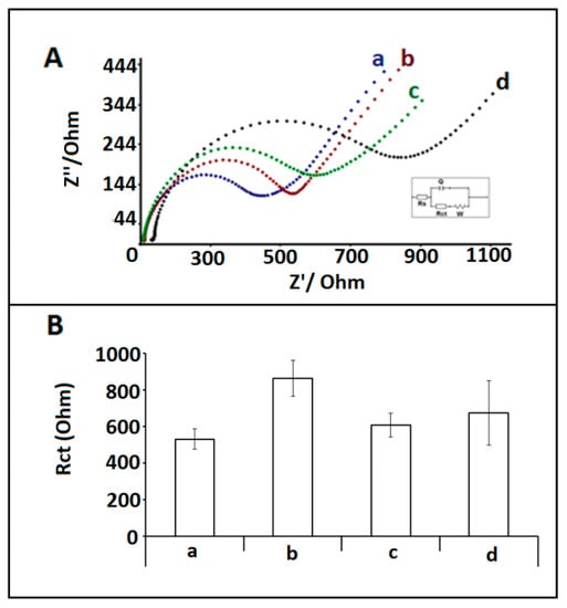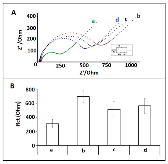 (A) Nyquist diagrams representing the Rct values obtained by (a) 1 µg/mL miRNA-34a probe modified /IL/CA/PGE in FBS (1:10), hybridization between 1 µg/mL miRNA-34a DNA probe and 10 µg/mL (b) miRNA-34a target, (c) miRNA-155a, (d) miRNA-181b in FBS (1:10). (B) Histograms representing the Rct values obtained by (a) 1 µg/mL miRNA-34a probe modified /IL/CA/PGE in FBS (1:10), after hybridization between 1 µg/mL miRNA-34a DNA probe and 10 µg/mL (b) miRNA-34a target, (c) miRNA-155, (d) miRNA-181b in FBS (1:10).