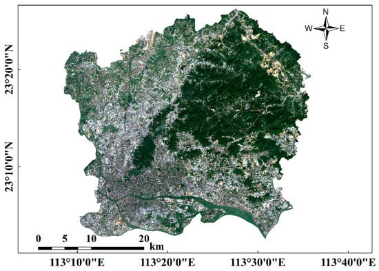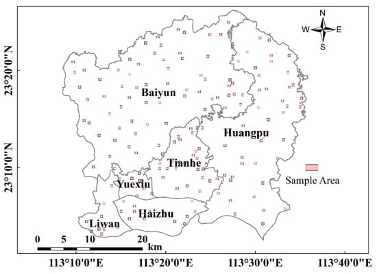 The city of Guangzhou (22°26′ N–23°56′ N, 112°57′ E–114°30′ E), which is located in south-central Guangdong in southern China, is the political, economic, and cultural center of the province of Guangdong. Guangzhou contains nine administrative districts and two county-level cities. The central area of Guangzhou was selected as the study area, and includes the districts of Liwan, Yuexiu, Haizhu, Tianhe, and Huangpu (Figure 1). The study area has a subtropical monsoon climate, with a mean temperature of 20–22 °C and abundant rainfall. The annual rainfall reaches 1720 mm, most of which occurs from April to June due to the East Asian Monsoon []. Due to the high impervious areas, the study area may be affected by rainstorm waterlogging.
