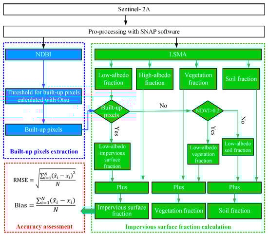 The extraction process for impervious surface fraction based on the Sentinel-2A L2A reflectance product contained three major steps: (1) extracting the built-up pixels automatically via Otsu’s method; (2) extracting fraction maps of high-albedo, low-albedo, vegetation, and soil using LSMA; and (3) modifying the fractions of impervious surface, vegetation, and soil by combining the built-up image and NDVI. The detailed process of impervious surface extraction is shown in Figure 2.