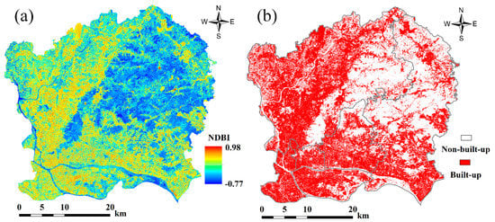 (a) Normalized difference built-up index (NDBI; warmer colors indicate a higher index); and (b) non-built-up (white) and built-up (red) areas extracted using Otsu’s method.