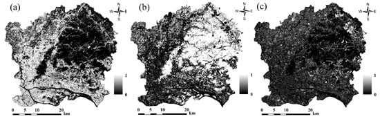 Fraction maps (lighter shades represent increasing representation on a 0–1 scale) extracted from Sentinel-2A imagery via modified LSMA: (a) impervious surfaces, (b) vegetation, and (c) soils.