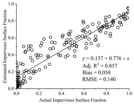 The results of accuracy assessment extracting impervious surfaces from the Sentinel-2A image are shown in Figure 6. The estimated impervious surface fraction of MLSMA is consistent with the actual impervious surface fraction (Figure 6). The RMSE and bias of the impervious surface fraction were 0.140 and 0.050, respectively. There was a large adjusted determination coefficient (Adj. R2 = 0.857) in the MLSMA. This indicates that MLSMA can be applied to the Sentinel-2A image to extract the impervious surface fraction, and that it does significantly contribute to extract high-precision impervious surface fractions.
