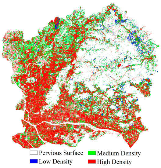 The impervious surface fraction was estimated by using the low- and high-albedo fractions and the built-up image extracted by Otsu’s. In the built-up image, pixels with a value of 1 were classified as built-up pixels; on the contrary, pixels with a value of 0 were classified as non-built-up pixels. In the built-up pixels, the impervious surface fraction was equal to the sum of low- and high-albedo fractions; in the non-built-up pixels, the impervious surface fraction was equal to the high-albedo fractions and the low-albedo fraction was classified low-albedo pervious surface fraction. For the low-albedo pervious surface fraction, if pixels had an NDVI value less than 0.2, the soil fraction was estimated by the addition of original soil and low-albedo pervious surface fractions. Otherwise, the vegetation fraction was calculated by the summation of original vegetation and low-albedo pervious surface fractions. A detailed explanation of this process can be found in the work of Xu et al. [].