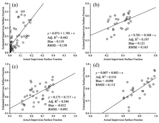 Scatter plot of accuracy assessment results for different impervious surface fractions from 170 sample areas: (a) 0–20%, (b) 20–49%, (c) 50–79%, (d) 80–100%.