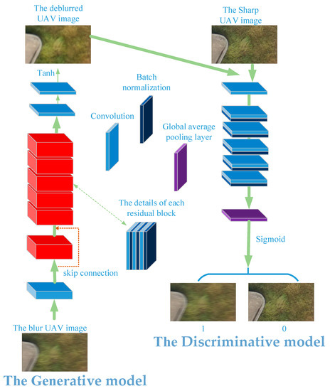 The GAN-based networks take the image as input and output a percentage, indicating the probability that the input image is a blurred UAV image. In order to make the proposed networks provide better prior images, different blur levels and sizes of images are input into the networks. The proposed networks consist of generative model G and discriminative model D as shown in Figure 1.