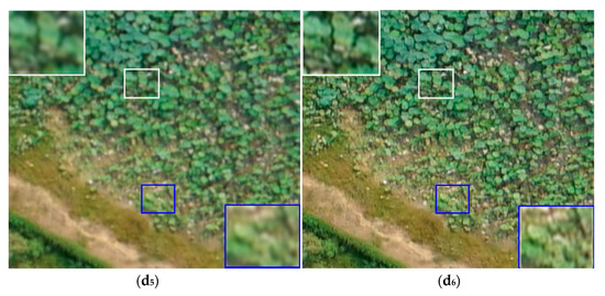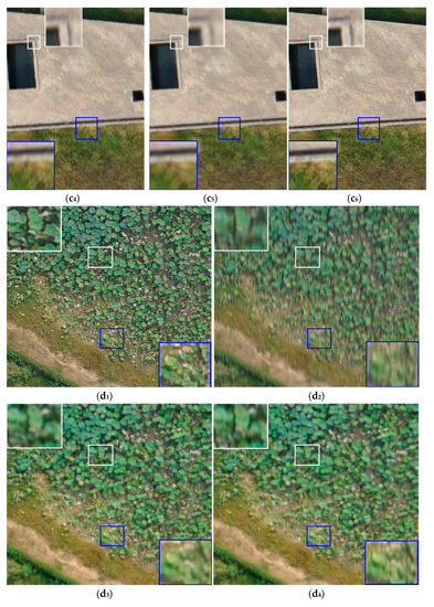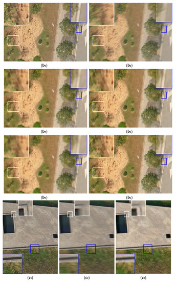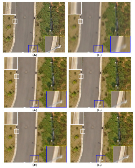 In Figure 2, we provide the experimental results for four UAV images of different ground objects to which synthetic blurring of different sizes and intensities were added. The labels a1–d6 indicate the real clean UAV images, the labels a2–d2 indicate the synthetically blurred UAV image (with synthetic blur of different sizes and intensities added), the labels a3–d3 indicate the deblurred UAV images from method [17]. The labels a4–d4 indicate the deblurred UAV images from method [59], the labels a5–d5 indicate the deblurred UAV images using method [38], and the labels a6–d6 indicate the deblurred UAV images from proposed method. In each of the images, small rectangles in white and blue identify areas enlarged for examination shown in the larger white and blue rectangles inserted each series of images.