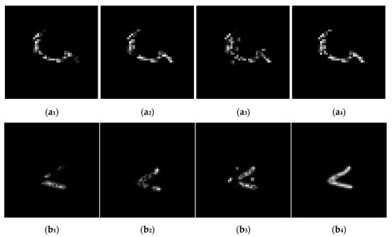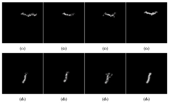 The estimated blur kernels of deblurring UAV images shown in Figure 2. The images (a1–a4) are the estimated blur kernels of (a3–a6) seen in Figure 2, the images (b1–b4) are the estimated blur kernels of (b3–b6) found in Figure 2, the images (c1–c4) are the estimated blur kernels of (c3–c6) seen in Figure 2, and the images (d1–d4) are the estimated blur kernels of (d3–d6) found in Figure 2.