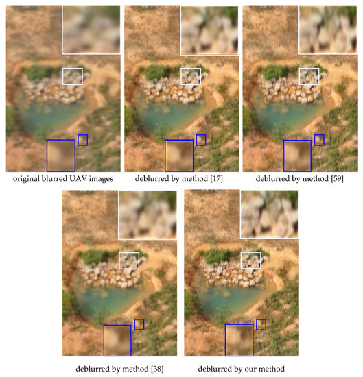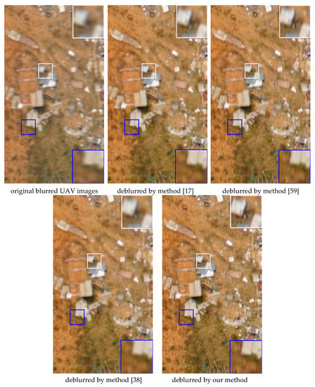Testing results of several deblurring methods for real blurred UAV images (the proportional scale of figure is 49%). In each group of images, the 1st images are the original blurred UAV images; the 2nd images present the deblurring results from method [17]; and the 3rd images present the deblurring results from method [59]. The 4th images present the deblurring results from method [38]; the 5th images present the deblurring results from the proposed method.