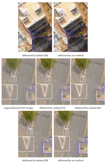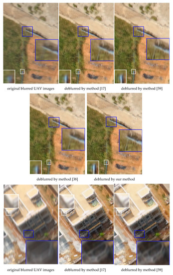 After the training process of the GAN-based networks converge, the trained model was used as the latent prior image. In all the experiments, we set = 0.005, = 0.005, and = 2. We evaluated the proposed algorithm on synthetic blurred UAV images and real blurred UAV images. The testing dataset was photographed in other mapping areas, which is obtained by a CW-10 in Wuhan City (Hubei Province, China) where the camera was an ILCE-7R with a focal length of 28 mm, the size of entire image was 7360 × 4916 pixels and the flying height was 400–600 m. One part of the testing dataset included originally sharp UAV images. We artificially added synthetic blurring with different sizes and intensities to these data, as shown in Figure 2. The other part of the testing dataset were the real blurred UAV images. The proposed method was compared qualitatively and quantitatively to method [17], method [59] and method [38]. We chose the method [17] because it is related to remote sensing images deblurring, and therefore comparable. The method [59] and method [38] were seen as a widespread reference, and they closely related to our work, so they can be used as a comparatively valuable references for this paper.