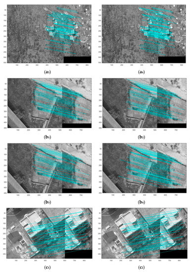 The better deblurred images tend to restore better the local features found in the UAV images. If conducting a matching method based on local features to match a deblurred image with a sharp image in the same region, the better matching results should be able to demonstrate the better deblurring results, so we try to compare the deblurring results from the perspective of image matching. Because the UAV platform for acquiring images consists of multiple cameras—the left-view, the front-view, the right-view, the back-view, the down-view camera—this allows us to obtain images from different angles in the same mapping area. In order to further verify our method, the deblurred UAV images gathered by several methods are matched with the clear images of different cameras in the same mapping areas so that the results of the matching experiments are employed to compare the results of deblurring.