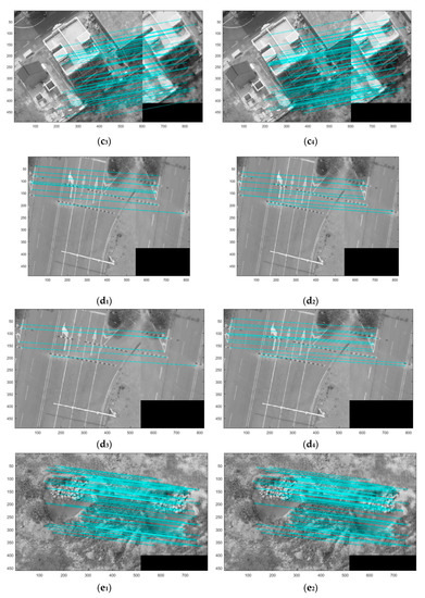 In each matching image (the proportional scale of figure is 30%), the left image is the sharp UAV image, and the right image is the deblurred UAV image. The 1st images (a1–e1) present matching results from SIFT and the deblurred UAV images using method [17] and sharp UAV images. The 2nd images (a2–e2) present matching results from SIFT and the deblurred UAV images using method [59] and the sharp UAV images. The 3rd images (a3–e3) present matching results from SIFT and the deblurred UAV images created by method [38] and sharp UAV images; and the 4th images (a4–e4) present matching results from SIFT and the deblurred UAV images using proposed method and the sharp UAV images.