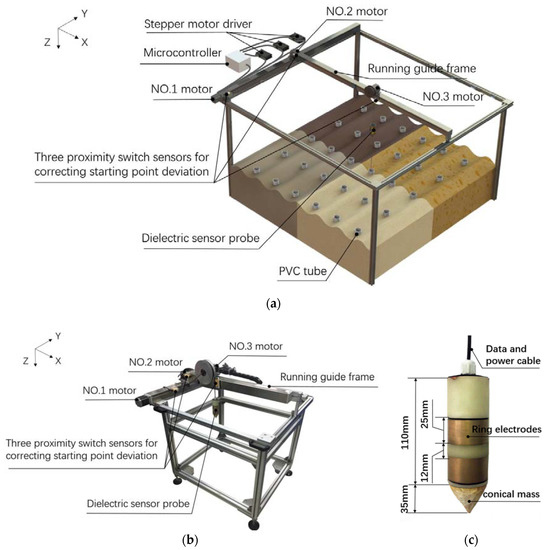 The framework of the three-dimensional tomography system was made of aluminum alloy, as shown in Figure 1. The size of the framework can be adjusted according to area of a specific experimental plot. There are three stepper motors (57HS7630A4, SUMTOR Electric Equipment Co., Ltd., Wuxi, China) and three proximity switch sensors (E18-D50NK, PeiYi Electric Co., Ltd, Wenzhou, China) mounted on the framework. The No. 1 motor controlled running guide frame moving in horizontal Y-Axis direction, No. 2 motors controlled dielectric sensor probe together with No. 3 motor moving in horizontal X-Axis direction perpendicular to Y-Axis and the No. 3 motor controlled the dielectric probe moving in vertical Z-Axis direction. The three proximity switch sensors were used for correcting the starting point deviation of the three mutually orthogonal directions. A PVC-tube array was installed in-situ under the framework without disturbing the soil structure [14,17].