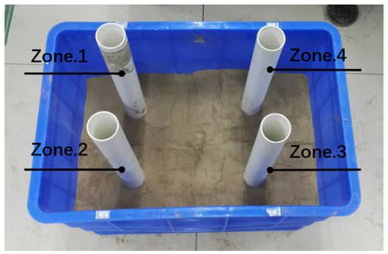 The experiment was carried out in a soil tank under laboratory conditions. The size of the tank is 555-mm length × 355-mm width × 430-mm height, as shown in Figure 4. To test the developed tomography system for 3D SWC measurements, we created a heterogeneous soil condition. The air-dried soil samples were separated into two groups and moistened at two different water content levels for preparing layered soil condition (Layer-1 and Layer-2). We randomly collected and oven-dried three samples of each group to determine initial gravimetric SWC. The initial gravimetric SWC in Layer-1 was 0.130 ± 0.003 g g−1 and that in Layer-2 was 0.095 ± 0.003 g g−1. A 20-cm height soil sample (Layer-1) filled in the tank was divided into four parts with identical volume but different bulk densities (Zone-1: 1.428 g cm−3; Zone-2: 1.165 g cm−3; Zone-3: 0.902 g cm−3; Zone-4: 0.729 g cm−3). Prior to this, a 10-cm height soil sample (Layer-2) was firstly filled at the bottom of the soil tank with identical bulk density (1.10 g cm−3). The detailed information was shown in Table 1. In this way, the spatial variability of soil properties (bulk density and initial SWC) at horizontal and vertical profiles was achieved. The PVC tube with a height of 560 mm was installed in-situ at the center of each zone to measure SWC.