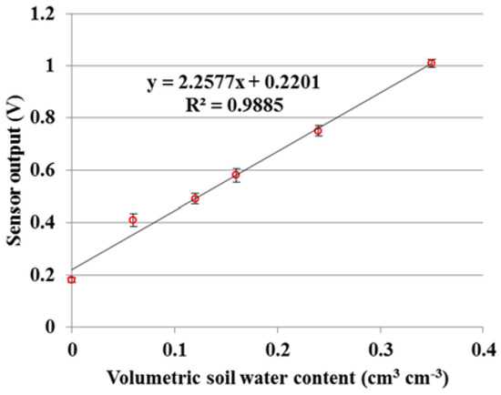 The dielectric sensor was calibrated with a loamy soil (sand: 42.1%, silt, 44.2%, clay: 13.7%) under laboratory condition at a room temperature of 21 ± 1 °C. The level of VSWC ranges from 0 to 0.35 cm3 cm−3 as shown in Figure 5. The calibration curve obtained is linear expression y = 2.2577x + 0.2201 with a high determination coefficient (R2) equaling to 0.9885 between the VSWC and sensor output voltage.