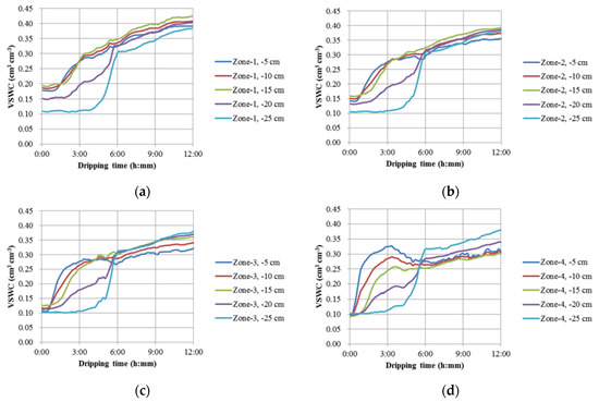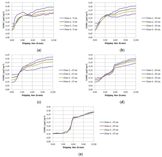 Figure 7 shows the temporal variations of the soil water content along the horizontal direction (X- and Y-Axis) at the depths of 5 cm (−5 cm), 10 cm (−10 cm), 15 cm (−15 cm), 20 cm (−20 cm) and 25 cm (−25 cm) under single-drip irrigation condition, which clearly reflected the heterogeneous soil conditions with different bulk densities. For example, in Figure 7a, due to the highest soil bulk density in Zone-1, the VSWC values did not increase until ca. 1 h later, which indicated the water infiltration rate were lowest compared with the other three zones (Zone-2, ca. 40 min; Zone-3, ca. 30 min; Zone-4, ca. 20 min). However, the differences of the infiltration rates gradually disappeared at Layer-2, indicating a longer delay of the water infiltration between Layer-1 and Layer-2, especially when the soil bulk density was lower. This may attribute to the higher soil porosity that led the water to move faster in this zone and thus, the soil matric potential was increased to a higher value in comparison with the soils with lower porosity, and the water may easily move from the zones with lower soil density to those with higher soil bulk density.