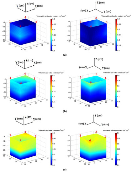 Monitoring variation of soil water content (SWC) in three dimensions (3D) can benefit researchers studying agricultural water management, soil hydrological process, fluid pollutant transport phenomena, etc., in heterogeneous soils [1] where spatial variability of soil properties and field and meteorological conditions significantly affect the distribution of SWC at different scales [2,3,4,5,6,7,8]. With this intention, diverse sensor techniques such as time-domain reflectrometry (TDR) [9], frequency-domain impedance (FDI) sensor [8], neutron moisture meter (NMM) [10], heat pulse (HP) sensor [11] and electrical resistivity tomography (ERT) [12] have been developed and widely used to monitor the temporal variations of soil water content at multiple positions.