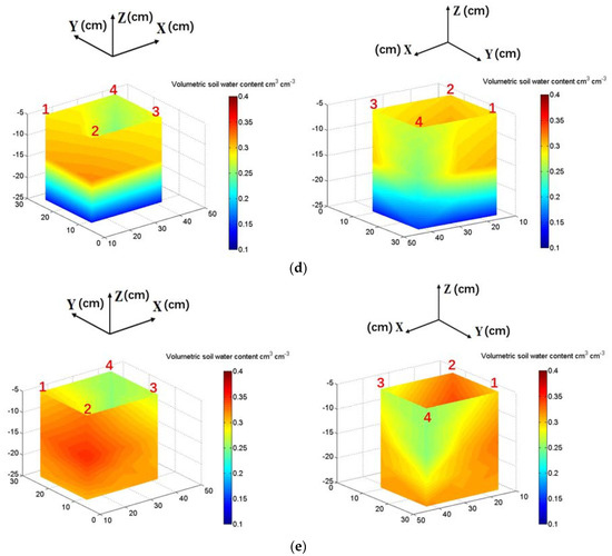 Figure 8 exhibits a group of 3D SWC maps generated from the data in Figure 6 and Figure 7 at the time of 0:00, 1:30, 3:00, 4:30 and 6:00. At the time of 0:00, the 3D distribution map of the SWC (Figure 8a) at Layer-1 (−5, −10 and −15 cm) shows a higher initial VSWC at Zone-1 with a lighter blue color. At the time of 1:30 (Figure 8b), due to the fast infiltration at Zone-3 and Zone-4, the color at −5 cm turned to green, with the VSWC values higher in comparison with those at Zone-1 and Zone-2. At the time of 3:00 (Figure 8c), the VSWCs were saturated at −5 cm and the wet front penetrated deeper to the −15 cm. At the time of 4:30 (Figure 8d), the VSWCs at −5, −10 and −15 cm were saturated and the wet front had already arrived at the −20 cm. At the time of 6:00 (Figure 8e), the wet front penetrated over the depth of 25 cm and the soil in the tank were almost saturated.