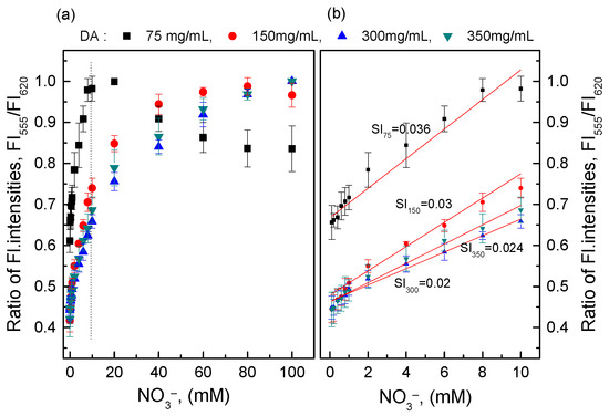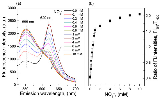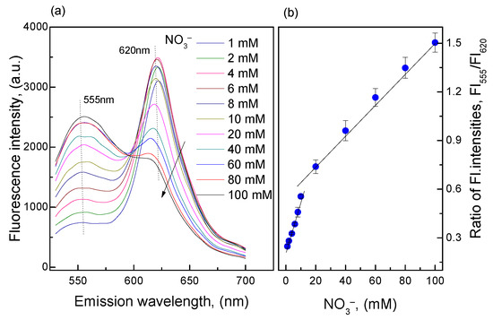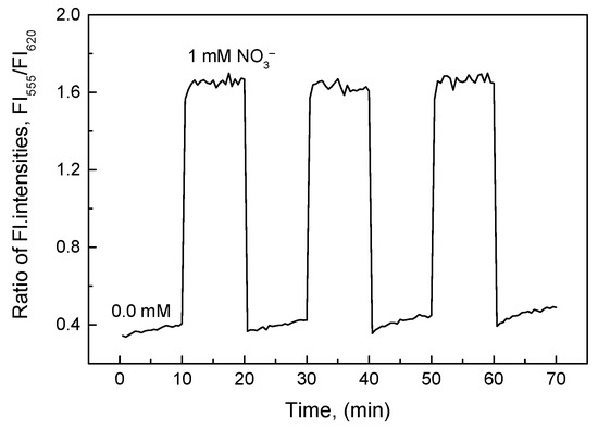 Figure 2 shows that large amounts of ammonia were produced from the reductive reaction of nitrate in the concentration range of 1–100 mM and the O17-EC membrane responded well to these amounts of ammonia. The calibration curve collected from the ratio of fluorescence intensities at peaks of λem = 555 and 620 nm (FI555/FI620) shows two linear detection ranges for nitrate: 1–10 mM (r2 = 0.989) with an LOD = 0.346 mM and 10–100 mM (r2 = 0.981) with an LOD = 9.89 mM. According to our previous study [22], the O17-EC membrane can detect ammonia in the range of 0.06–3.5 mM, but in this case when the nitrate concentration was lower than 1 mM, the sensitivity of the O17-EC membrane was very low compared with the sensitivity of the O17-EC membrane at nitrate concentrations greater than 1 mM. This is due to the loss of ammonia produced from the reductive reaction of nitrate to the ammonia measurement, and subsequently the remaining ammonia concentration reached the minimal threshold of this range. However, the wide detection ranges of the O17-EC membrane to nitrate shown in Figure 2 also indicated that the O17-EC membrane can extend the linear detection range for ammonia in some typical conditions, since the moles of nitrate and ammonia are equal amounts in Equation (2).