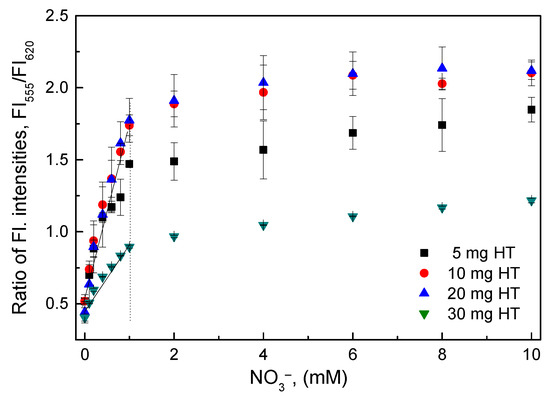 The O17-HT-EC membrane was undamaged after 1 month of continuous use and showed high sensitivity to nitrate (Figure 7). However, the slope value (SI = 0.934) of the calibration curve decreased by about 21.2% as compared with the slope value (SI = 1.186) at the initial use in the nitrate concentration range of 0.1–1 mM. As mentioned above, the clay HT could release ammonium cations slowly when being cleaned at each measurement. Also, during the measurements of nitrate for the evaluation of other parameters, a small amount of ammonium cations was conjugated with negatively charged layers (CO3·4H2O2−) of the clay HT in the O17-HT-EC membrane. This led to an increase in the fluorescence intensity at an emission wavelength of 555 nm, resulting in an increase of the ratiometric fluorescence intensity at the background signal as shown in Figure 7.