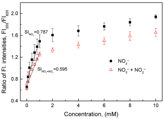 When adding interference to a given concentration of nitrate, the differences in the ratio of fluorescence intensities were assessed by one-way analysis of variance (ANOVA). Significant differences between samples were accepted with p-values of < 0.05. Statistical tests were performed using the InStat software (vers.3.01, GraphPad Software Inc, San Diego, CA, USA).
