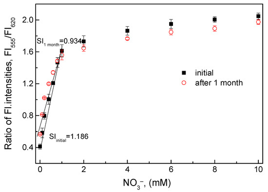 Change in the ratiometric fluorescence intensities of the O17-HT-EC membrane in the nitrate concentration range of 0.1–10 mM at initial use and after 1 month.