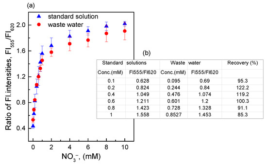 From the response of the O17-HT-EC membrane when exposed to nitrate in the standard solutions (Figure 8) we obtained the linear equations, such as Y (ratiometric fluorescence intensity) = 1.008 × X (nitrate concentration) + 0.594 (r2 = 0.982), for the O17-HT-EC membrane. Based on the linear equations, the concentrations of nitrate present in artificial waste water were calculated as shown in Figure 8 (inset table). The recovery of the O17-HT-EC membrane obtained was about 85–122% in the nitrate concentration range of 0.1–1.0 mM. This was achieved due to the presence of salts in artificial waste water, which prevented the reduction of nitrate to ammonia. According to Daniel et al. [5], the salinity of water has significant effects on the reaction kinetics of nitrate. That is, low salinity (>10 µM) leads to faster reaction development, but the reduction of nitrate is inhibited at high salinity. Thus, the NaCl concentration of 4.5 mM in this work could be one of the reasons for the interference in the reduction of nitrate, leading to a low response of the O17-HT-EC membrane to the smaller amount of ammonia produced.