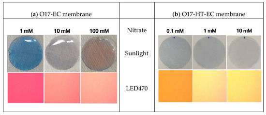 The visual color transition of the O17-HT-EC membrane is shown in Figure 9b. Under sunlight, the color transition of the O17-HT-EC membrane was unclear between 0.1 mM and 1 mM nitrate, but the light blue color of the membrane tended toward a light purple color at 10 mM nitrate (round images). Different from the color transition under sunlight, the color transition of the O17-HT-EC membrane under LED470 irradiation was clearly observed (square images). The orange color of the O17-HT-EC membrane at 0.1 mM nitrate was changed to a mixed color of light yellow and pink at 1 mM nitrate and changed to a yellow color at 10 mM nitrate.