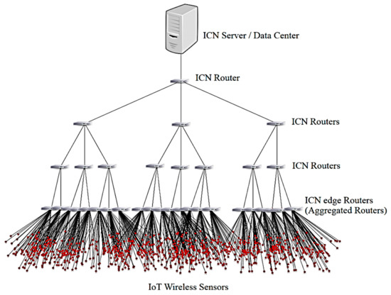 We select the tree topology to closely reflect how the content data varies at different levels of the network topology (Figure 1). This type of topology also represents typical sensor-enabled content dissemination scenarios for various practical wireless applications. In this model, a wireless sensor connects to the ICN edge routers, and we assume that each ICN Router can store content data in its cache storage and has all the features as of an NDN node. Particularly, the forwarding scheme of NDN includes three fundamental components, namely Forwarding Content Store (CS), Information Base (FIB), and Pending Interest Table (PIT) [37]. In NDN, consumers request their desired data by sending Interest packets (content requests) to the network and producers will reply the corresponding Data packets of the desired content. Also, NDN features support application-driven approaches for sensor networking in practice.
