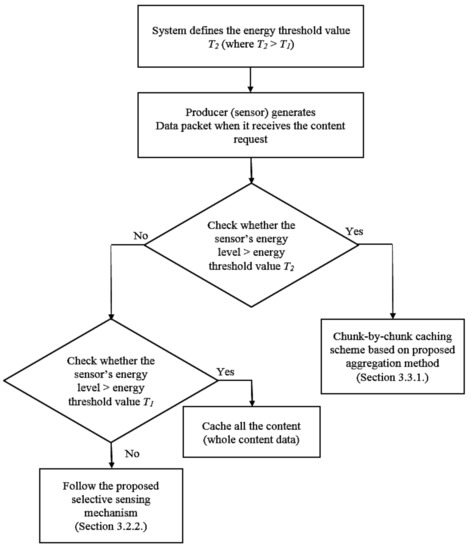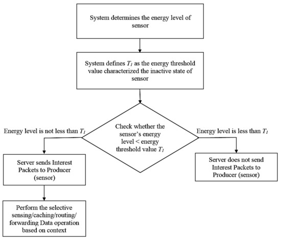 As shown in Figure 2, to decrease the congestion rate in ICN, we propose an adaptive sensor scheduling scheme for minimizing the number of transmitted interest packets. Specifically, we characterize T1 as the threshold value of the sensor’s inactive state. If the system identifies that the sensor energy level is less than T1 (i.e., the sensor in inactive mode), the server does not send Interest packets to the sensor to minimize the congestion rate due to packet flooding mechanism in ICN. Otherwise, the server sends interest packets to the sensor and performs the selective sensing, caching, routing and forwarding data operation based on context. This mechanism will be stated in the next sections.