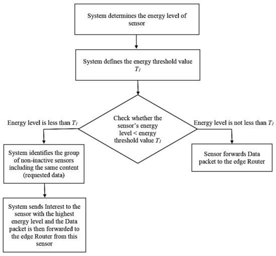 In particular, in the situation when a sensor is in the inactive mode and the server needs to get data content from it, we consider that the requested data should be served by another sensor with the matched content from the network. We then propose selective sensing mechanism to improve the QoS in ICN (Figure 3). To do this, the system firstly determines the current sensor energy level then compares that value with T1. If the sensor energy level not less than T1 value, then the system forwards the content to the edge router. Otherwise, the system defines the group of non-inactive sensors including the same desired content data. Then, the system selects sending the Interest packet to the sensor with the highest energy level and the data will be forwarded to the attached edge Router from this sensor.