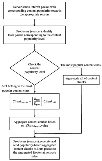 The detailed chunk-based aggregation scheme is depicted in Figure 4, in which the server sends Interest packets with the corresponding content popularity to the appropriate sensor with matched data. Next, the sensors generate the data packets by aggregating content chunks based on popularity of the content. Particularly, to reduce traffic needs for saving network system resources, we introduce chunk-by-chunk aggregation corresponding to the content popularity. To do this, the system checks content popularity to identify whether a content is popular or not. Then, if the content is belonging to the most popularity class, all the content chunk will be aggregated as a whole for the data packet. Otherwise, the sensors send aggregated content chunks to the aggregated router at network edge with Chunkratio according to content popularity level as defined by (2).