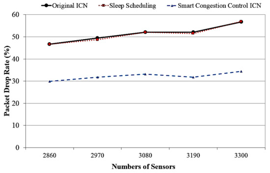 Figure 6 depicts the Interest packet drop rate corresponding to various numbers of sensors between the proposed models, sleep scheduling ICN model, and traditional ICN design. In this evaluation, a packet drop means that an Interest packet is discarded at the ICN content node due to packet collision caused by high traffic (i.e., do not get returning data packets as acknowledgement messages (ACKs) or data packet loss after a period of time). The results show that our ICN models can get less Interest packet drop rate of content requests than other ICN systems. Especially, our proposed ICN system can get much higher performance in terms of low packet drop rate when the network scale gets larger (i.e., high number of sensors). This result confirms that the proposed system is a promising scalable solution which can gain the high network performance (low packet drop rate) for the goal of reducing the network congestion.