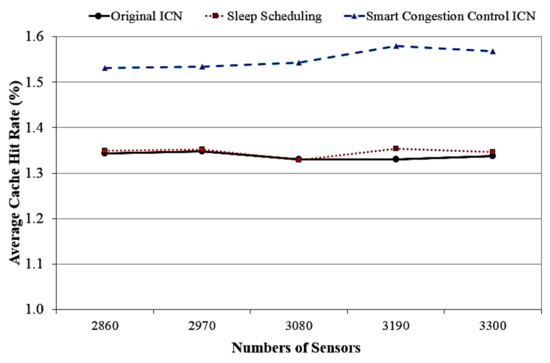 Subsequently, Figure 7 presents the cache hit rate of our proposed ICN model, sleep ICN model, and original ICN system in accordance with various numbers of sensors. The evaluation result shows that the proposed smart congestion control ICN can gain a higher cache hit rate than the sleep ICN model and the traditional ICN design. This is because the proposed system integrates both sensor power-based cache management scheme and chunk-level aggregation scheme for forwarding strategy.