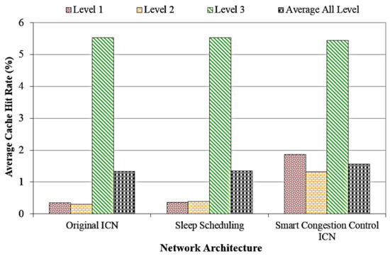 Following, Figure 8 analyses the cache hit rate at different network levels of the network topology of the traditional ICN, sleep scheduling ICN, and the proposed system with the highest numbers of sensors for evaluation (3300 sensors). The results show that our ICN model can provide higher cache hit rate than other ICN models, especially at the first level of network topology. Hence, consumers do not need to get the content at the producer level because many content items already stored at nearest routers which are closed to the server. Thanks to the cache management policy, the proposed system can serve a high number of content objects with much lower latency and hop-count for a higher user’s Quality of Experience (QoE).