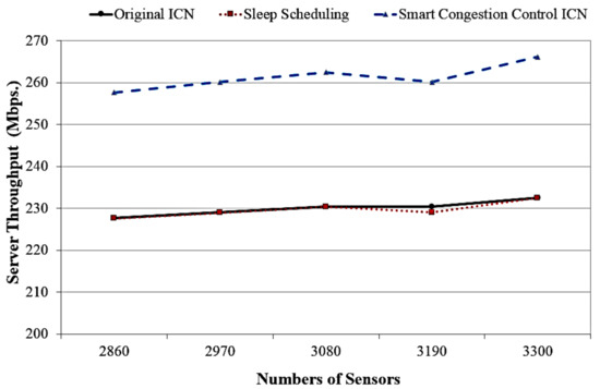 Figure 9 represents the server throughput corresponding to various numbers of sensors of the proposed ICN model, sleep ICN model and traditional ICN. The results show that our ICN system can gain higher server throughput than other ICN design. This is because the proposed system transmits content with chunk-based aggregated packets according to content popularity value as forwarding scheme, and implements cache management scheme as defined in previous sections.