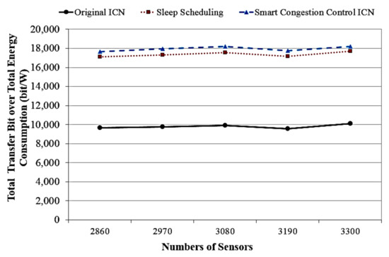 Subsequently, Figure 10 shows the total transfer bit over total energy consumption versus different numbers of the different network system. The evaluation results show that our ICN system can gain higher transfer bit than the sleep scheduling ICN and the traditional ICN. This result confirms that the proposed system is a promising solution which gains the higher EE performance for the goal of enabling a cost-effective networking model utilizing sensors for the IoT era.