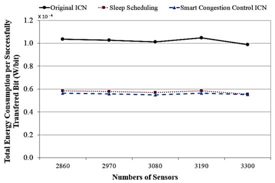 Finally, Figure 11 illustrates the total energy consumption per successfully transmitted bit in accordance with different numbers of sensors between our proposed ICN model and the two others relevant ICN systems. A successful transmission is identified when a corresponding data packet for the requested content is not received after an Interest packet is sent. The results show that our ICN system consumed lower energy per transmitted bit than original ICN and sleep ICN system. This shows that our proposed system is an efficient solution to diminish the network congestion rate, with higher network performance and energy efficiency at the same time in the context of ICN-based green IoT sensor.