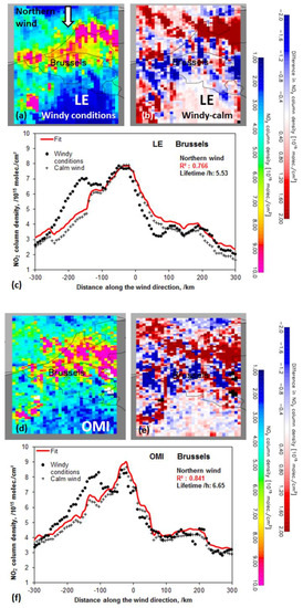 Next, we have computed for each wind sector the NO2 line density function over a distance of ~300 km downwind and ~300 km upwind from the city centre [15,16]. By averaging the NO2 data over the specified across-wind interval (2 × 100 km), the NO2 line densities are obtained as illustrated in Figure 1 for Brussels using LE (panel (c)) and OMI tropospheric NO2 columns (panel (f)) for each wind sector for both calm (indicated by +) as windy conditions (>5 m s−1) (indicated by ●).