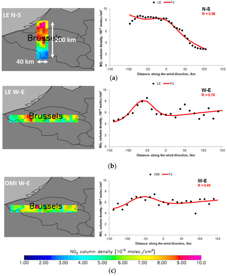 The averaged tropospheric NO2 columns of Brussels for the period April–September 2013 for calm wind conditions for LOTOS-EUROS data (LE) and OMI data. The maps on the left show the NO2 patterns for their specific wind directions using a 200 km range along and 40 km across the wind direction as indicated. The graphs on the right show the corresponding line densities with Equation (4) fit on the data. (a) shows the LE NO2 patterns and line densities for N-S winds, (b) shows the LE NO2 patterns and line densities for W-E winds, (c) shows the OMI NO2 patterns and line densities is for N-S winds.