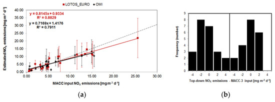 Top-down derived NOX emissions estimated from the tropospheric NO2 line densities for different European cities against the MACC-III emissions as used in LOTOS-EUROS (a). NOX emissions from LOTOS-EUROS versus MACC-III in red. OMI based versus MACC-III in black. For each NO2 data set the statistics (slope, intercept, correlation coefficient) are provided. The OMI derived emission of 4.28 ± 1.68 mg m−2 day−1 for St.-Petersburg is omitted from the figure. (b) The distribution of the difference of the top-down and MACC-3 input emissions.