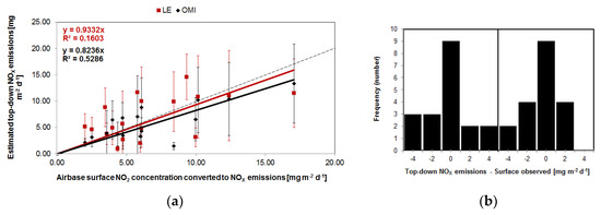 (a) Top-down derived NOX emissions estimated from the tropospheric NO2 line densities for different European cities against scaled Airbase measurements of surface NO2 concentrations. NOX emissions from LOTOS-EUROS versus MACC-III in red. OMI based versus MACC-III in black. No surface data available for St.-Petersburg, Moscow and Kiev. (b) The distribution of the difference of the top-down and surface based observed emissions.