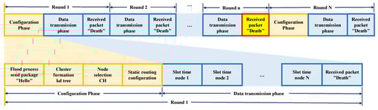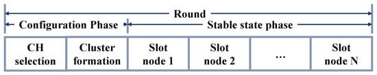 The “Death” packet informs the Sink/BS node that a node has just died. Nodes in a cluster transmit the “Death” packet to the Sink/BS node using their respective time slot. If a CH node dies, it transmits its “Death” packet to the Sink/BS node when queried by the Sink/BS node. At the end of each round, the Sink/BS node reviews which nodes sent a “Death” packet. In case a “Death” packet arrives at the end of a round, the Sink/BS node begins the configuration phase, as shown in