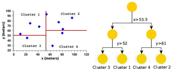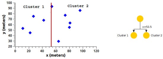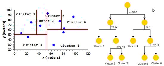 1) to form clusters and select CH nodes according to nodes’ residual energy and their distance to the Sink/BS node, H-kdtree uses the one-dimensional clustering principle taken from the k-d tree algorithm. This algorithm generates a hierarchical two-hop network topology similar to LEACH’s.