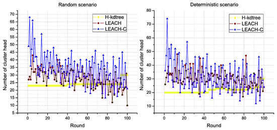 Table 3 show the low variability in the number of CH nodes. H-kdtree kept the number of CH nodes below the number of CH nodes generated by LEACH for the first 75 rounds (Q3). H-kdtree showed a reduction of 14.21% for the random scenario and of 30.14% for the deterministic scenario, as compared to LEACH.